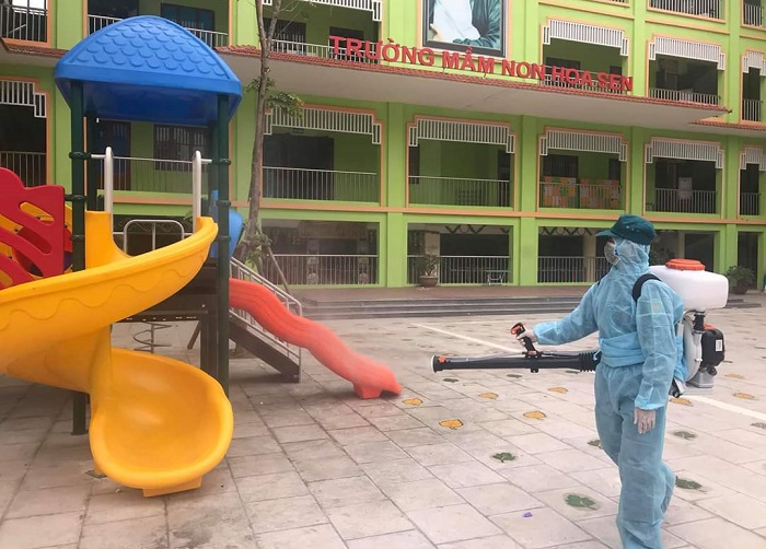 Các trường học phối hợp với cơ quan y tế phun thuốc khử khuẩn trường, lớp học.
