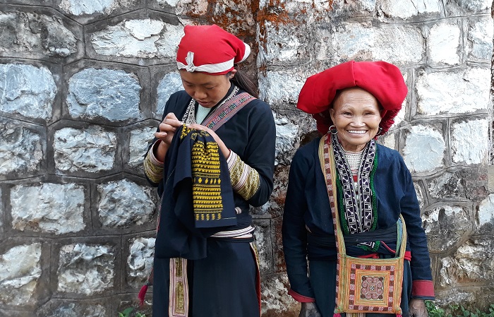 Những người phụ nữ Dao đỏ cũng thường đến đây để thêu thổ cẩm và bán các sản phẩm thổ cẩm cho khách du lịch. Bà Chẻo Mán Mẩy, năm nay đã 65 tuổi, luôn nở nụ cười rất tươi mỗi khi chuyện trò cùng du khách. Bà chia sẻ: “Bà bán thổ cẩm ở đây được mấy chục năm rồi. Ngày nhiều nhất cũng bán được hơn 300 ngàn đồng. Nhưng từ đầu năm đến nay, do dịch Covid-19 nên vắng khách lắm…”.