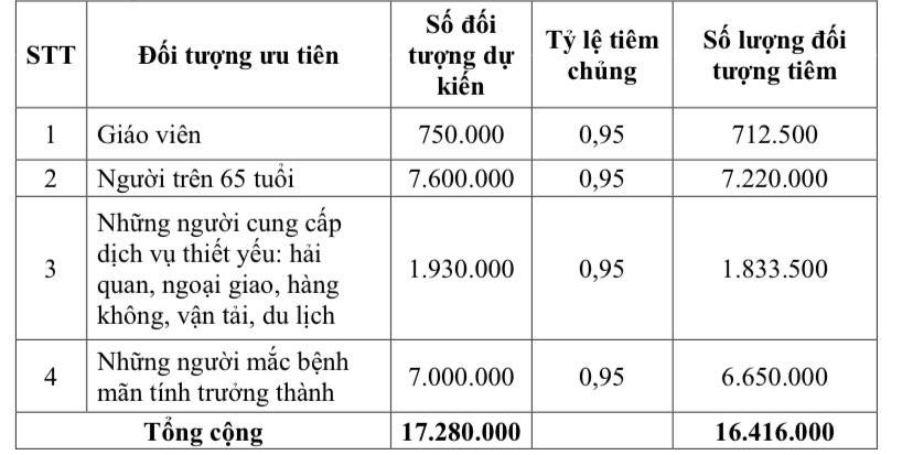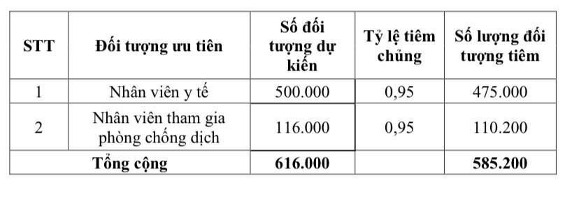 Các nhóm đối tượng cần tiêm vắc xin phòng COVID-19 sắp xếp theo mức độ ưu tiên theo tình huống dịch và trong bối cảnh nguồn vắc xin cung cấp hạn chế tại Việt Nam, bao gồm: