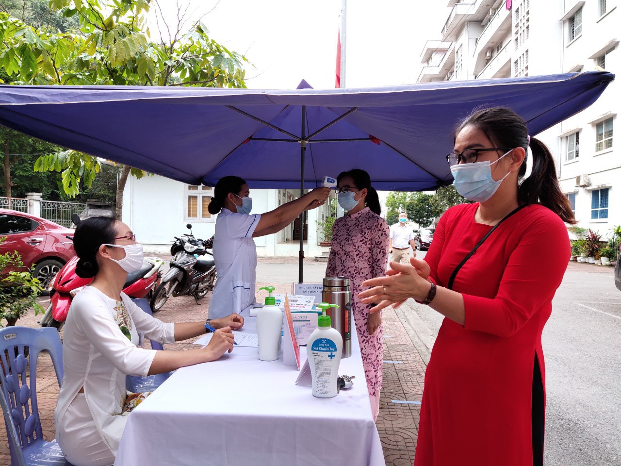 Thực hiện đo thân nhiệt, sát khuẩn, khai báo y tế trước khi vào bỏ phiếu.