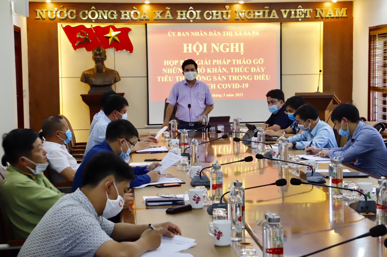 Phát biểu kết luận hội nghị, đồng chí Vương Trinh Quốc – Chủ tịch UBND thị xã Sa Pa đã chia sẻ những khó khăn trong tiêu thụ sản phẩm mà các doanh nghiệp, cá nhân đang gặp phải do tình hình dịch Covid-19 diễn biến phức tạp. Đồng thời, đồng chí khẳng định thị xã Sa Pa sẽ đề xuất với Sở Công thương hỗ trợ đưa sản phẩm nông sản đặc hữu Sa Pa lên kệ siêu thị lớn và các sàn thương mại điện tử; đề nghị UBND tỉnh tạo điều kiện, có cơ chế hỗ trợ vận chuyển nông sản đi tiêu thụ tại các thị trường ngoài tỉnh; đề nghị các ngân hàng có cơ chế giãn, đảo nợ, giảm lãi suất, tạo điều kiện thuận lợi để các doanh nghiệp, cá nhân hoạt động trong lĩnh vực sản xuất nông nghiệp tiếp cận với nguồn vốn ưu đãi, tái sản xuất sau khi dịch Covid-19 được khống chế.