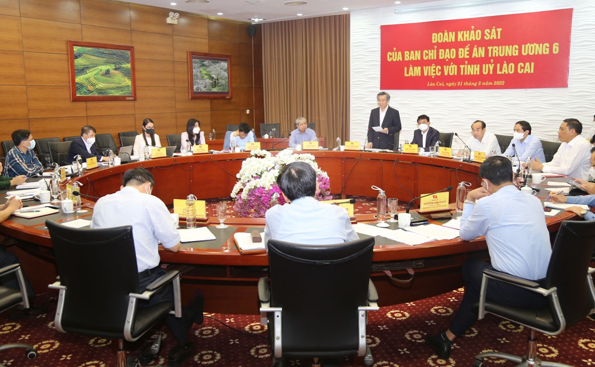 Chiều 21/3, Đoàn khảo sát của Ban Chỉ đạo Đề án Trung ương 6 về việc tổng kết thực hiện Nghị quyết Trung ương 5 khóa X về tiếp tục đổi mới phương thức lãnh đạo của Đảng đối với hoạt động của hệ thống chính trị do đồng chí Nguyễn Quang Dương, Ủy viên Ban Chấp hành Trung ương Đảng, Phó Trưởng Ban Tổ chức Trung ương, Phó Trưởng Ban Thường trực Ban Chỉ đạo Đề án Trung ương 6 làm Trưởng đoàn đã có buổi làm việc với Tỉnh ủy Lào Cai.Tham gia Đoàn khảo sát có các đồng chí Ủy viên Ủy ban Kiểm tra Trung ương, lãnh đạo các vụ, viện của Ban Tổ chức Trung ương.
