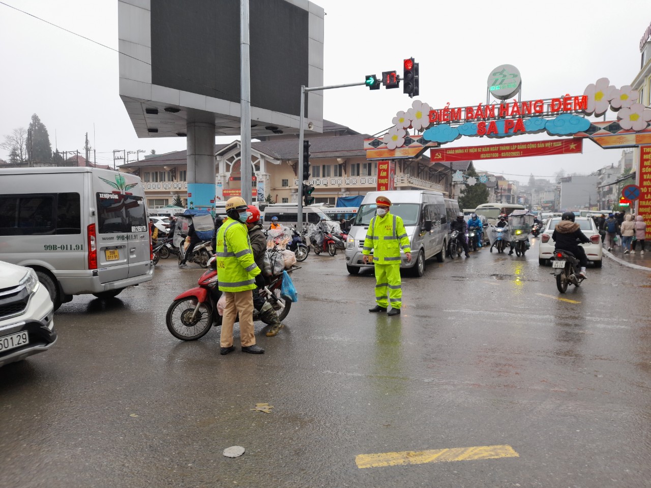 Lực lượng Cảnh sát giao thông thị xã Sa Pa duy trì trật tự, giảm ùn tắc cho các phương tiện tham gia giao thông.