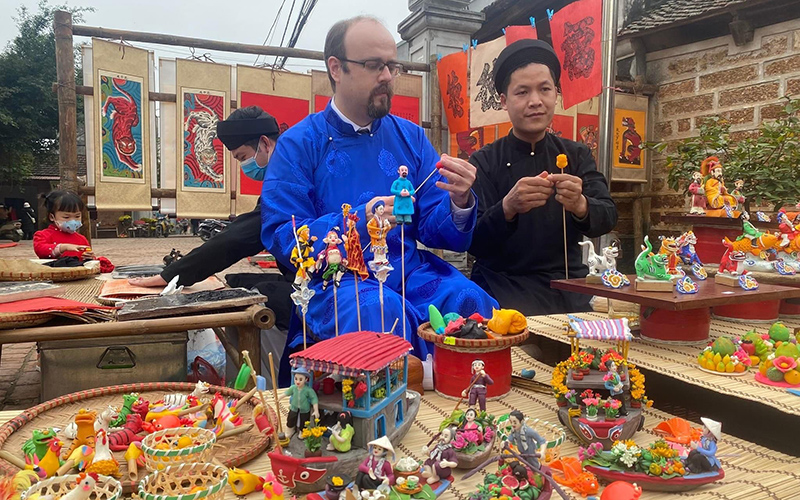 Khách du lịch quốc tế tham gia hoạt động trải nghiệm văn hóa ở làng cổ Đường Lâm, xã Đường Lâm, thị xã Sơn Tây (Hà Nội).