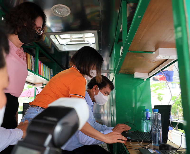 Đại biểu và học sinh các trường trải nghiệm đọc sách tại gian trưng bày và xe thư viện lưu động.