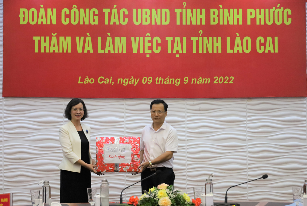Ủy viên Ban Thường vụ Tỉnh ủy, Phó chủ tịch UBND tỉnh Trần Tuyết Minh tặng quà lưu niệm của tỉnh Bình Phước đến lãnh đạo tỉnh Lào Cai