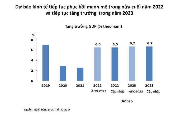 Trong đó, ADB giữ nguyên dự báo về triển vọng kinh tế Việt Nam tăng trưởng mạnh mẽ với tổng sản phẩm quốc nội (GDP) tăng 6,5% trong năm 2022 và 6,7% năm 2023.