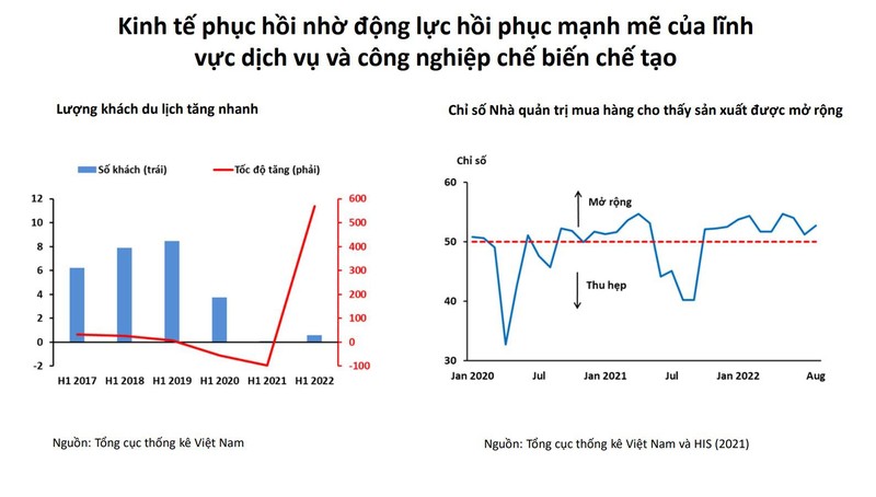 Đáng chú ý, theo báo cáo của ADB, trong 6 tháng đầu năm 2022, tăng trưởng khu vực dịch vụ phục hồi trở lại đạt mức 6,6% từ 3,9% trong cùng kỳ năm 2021, nhờ lượng khách du lịch trong nước tăng mạnh lên 60,8 triệu lượt khách. Lượng du khách trong nước cao hơn 1,9 lần so với 6 tháng đầu năm 2021 và gấp 1,3 lần so với con số trước đại dịch Covid-19.