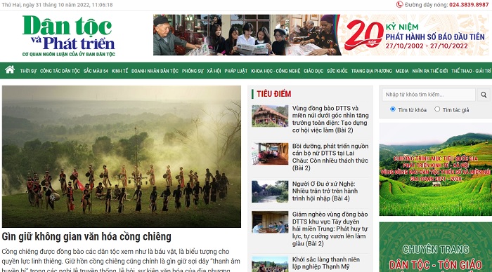 Giao diện trang chủ của Báo Dân tộc và Phát triển.