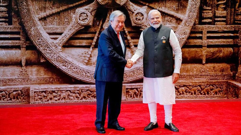 Thủ tướng Ấn Độ đón Tổng Thư ký Liên hợp quốc dự Hội nghị G20. (Ảnh: THESUNDAILY.MY)