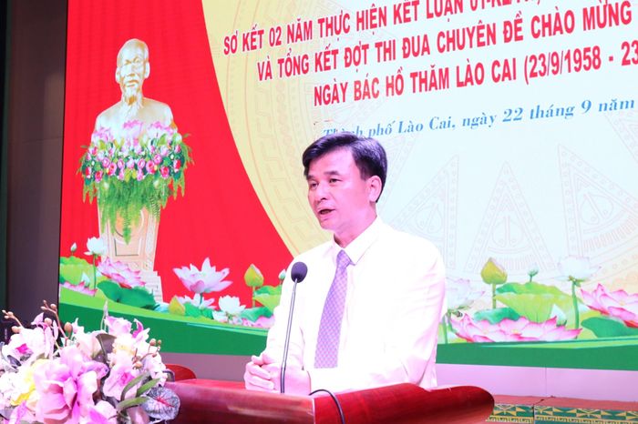 Đồng chí Đoàn Ngọc Tuyến, Phó Bí thư thành ủy Lào Cai báo cáo kết quả đợt thi đua chuyên đề chào mừng kỷ niệm 65 năm ngày Bác Hồ thăm Lào Cai (23/9/1958 - 23/9/2023), 75 năm ngày Bác Hồ ra Lời kêu gọi thi đua ái quốc (11/6/1948 - 11/6/2023) trên địa bàn thành phố Lào Cai.