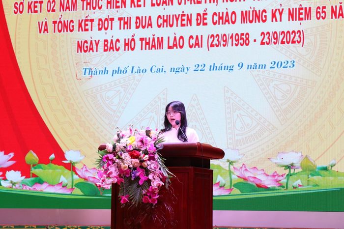 Em Phạm Minh Đức, học sinh lớp 12 Chuyên Hóa, Trường THPT Chuyên tỉnh Lào Cai, đạt giải Nhất nghiên cứu khoa học kỹ thuật cấp Quốc gia năm 2023 – Đại diện thế hệ trẻ thành phố Lào Cai phát biểu cảm tưởng và thể hiện quyết tâm học tập và làm theo Bác.