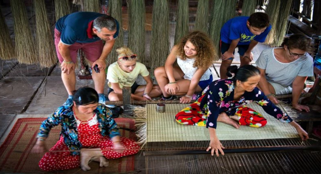 Du khách quốc tế trải nghiệm nghề làm chiếu thủ công. (Ảnh: Vietnamtravel)