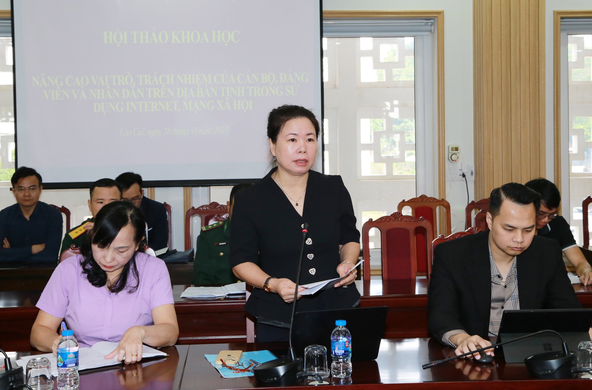 Tại hội thảo, các đại biểu đem đến nhiều góc nhìn, vấn đề và đặc biệt là đề xuất các giải pháp phù hợp với tình hình thực tiễn, như: Báo Lào Cai với tham luận về tuyên truyền chính trị trên internet, mạng xã hội; Liên đoàn Lao động tỉnh với tham luận tuyên truyền nâng cao nhận thức, trách nhiệm đối với lực lượng công nhân, người lao động trên địa bàn tỉnh trong sử dụng internet, mạng xã hội; Công an tỉnh tham luận về công tác tuyên truyền, giáo dục pháp luật về an toàn, an ninh mạng, kỹ năng khai thác, sử dụng internet, phát hiện và xử lý vi phạm - thực trạng và giải pháp; Sở Thông tin và Truyền thông tham luận về nhận diện thông tin xấu, độc trên mạng xã hội và trách nhiệm của mỗi công dân trong sử dụng internet, mạng xã hội…
