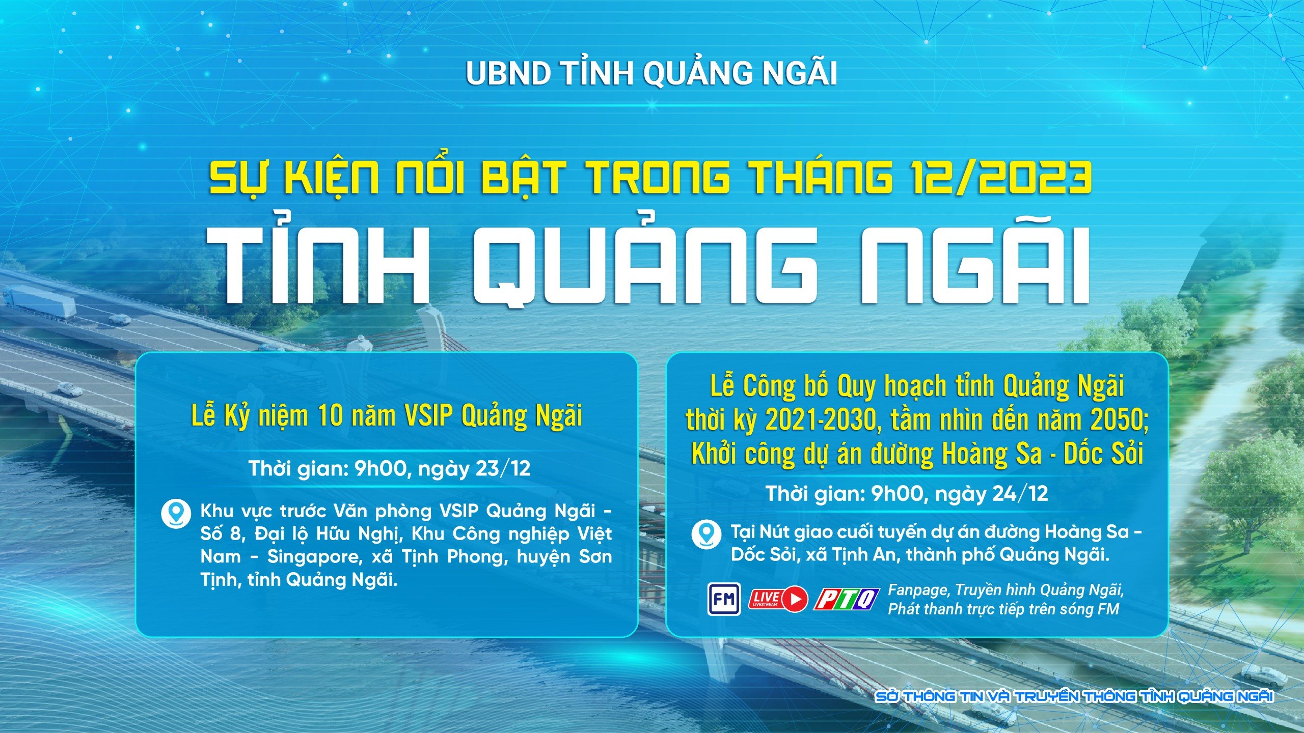 Ngày 24/12 cũng diễn ra Lễ khởi công dự án đường Hoàng Sa - Dốc Sỏi.Đây là dự án thuộc nhóm A, là công trình giao thông đường bộ cấp I; có tổng chiều dài tuyến là 26,88km (trong đó có 09 hạng mục công trình cầu), với điểm đầu tuyến giao với đường Trì Bình - Dung Quất, thuộc huyện Bình Sơn và điểm cuối tuyến kết nối với đường Hoàng Sa, tại nút giao đầu cầu Đập dâng sông Trà Khúc thuộc địa phận thành phố Quảng Ngãi. Tổng mức đầu tư dự án là 3.500 tỷ đồng, thời gian thực hiện năm 2022-2027.