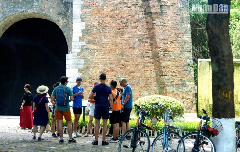 Khách du lịch nước ngoài theo tour tham quan Hà Nội bằng xe đạp tại thành Cửa Bắc trên phố Phan Đình Phùng. (Ảnh: T.LINH)