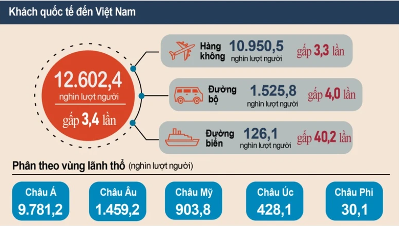 Trong tổng số 12,6 triệu lượt khách quốc tế, khách đến bằng đường hàng không đạt gần 11 triệu lượt người, chiếm 86,9% số lượng khách quốc tế đến Việt Nam và gấp 3,3 lần năm trước; bằng đường bộ đạt 1,5 triệu lượt người, chiếm 12,1% và gấp 4 lần; bằng đường biển đạt 126,1 nghìn lượt người, chiếm 1% và gấp 40,2 lần.