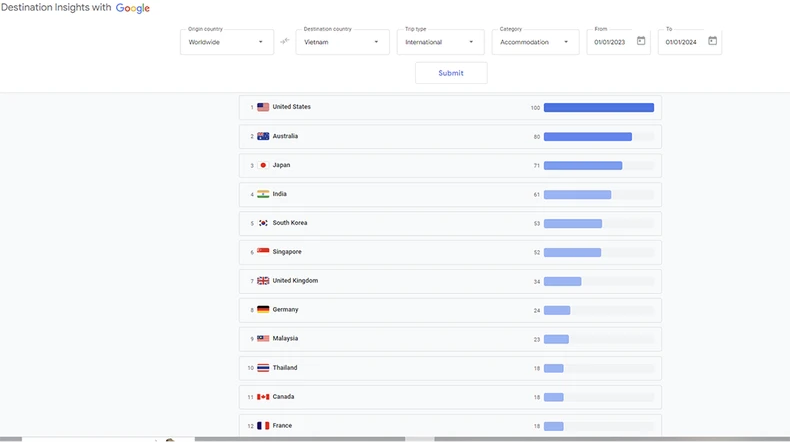 10 thị trường tìm kiếm nhiều nhất về du lịch Việt Nam gồm: Mỹ, Australia, Nhật Bản, Ấn Độ, Hàn Quốc, Singapore, Anh, Đức, Malaysia và Thái Lan.