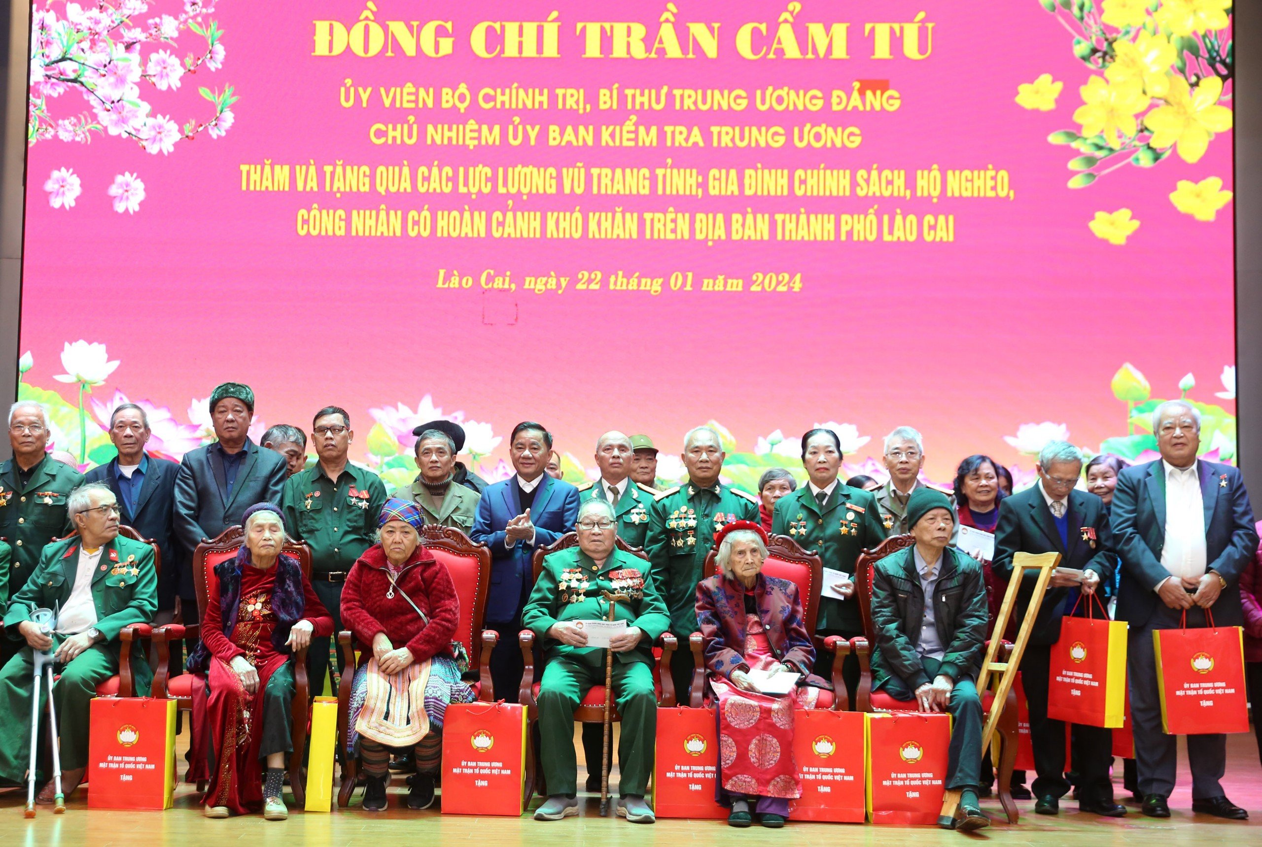 Đồng chí Trần Cẩm Tú - Ủy viên Bộ Chính trị, Bí thư Trung ương Đảng, Chủ nhiệm Ủy ban Kiểm tra Trung ương cùng lãnh đạo Tổng Liên đoàn lao động Việt Nam, lãnh đạo tỉnh Lào Cai đã trao các suất quà Tết cho lực lượng vũ trang; các gia đình chính sách, hộ nghèo; công nhân lao động có hoàn cảnh khó khăn, tại thành phố Lào Cai.