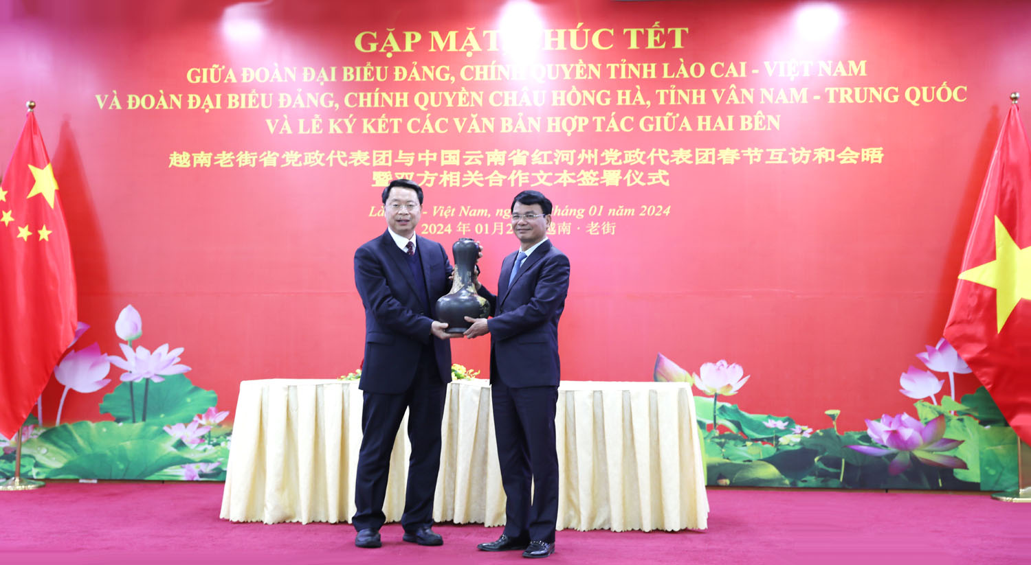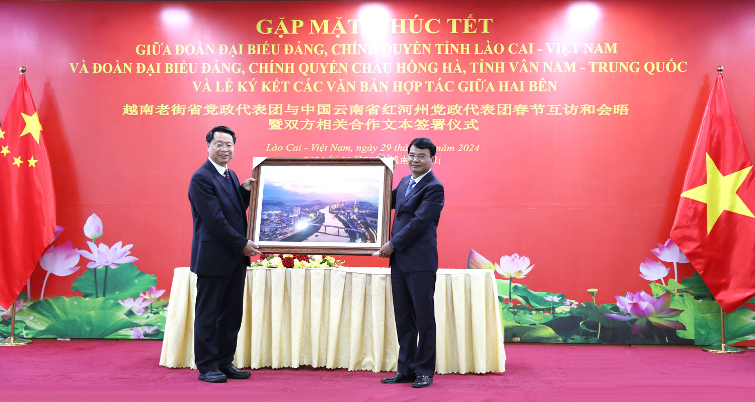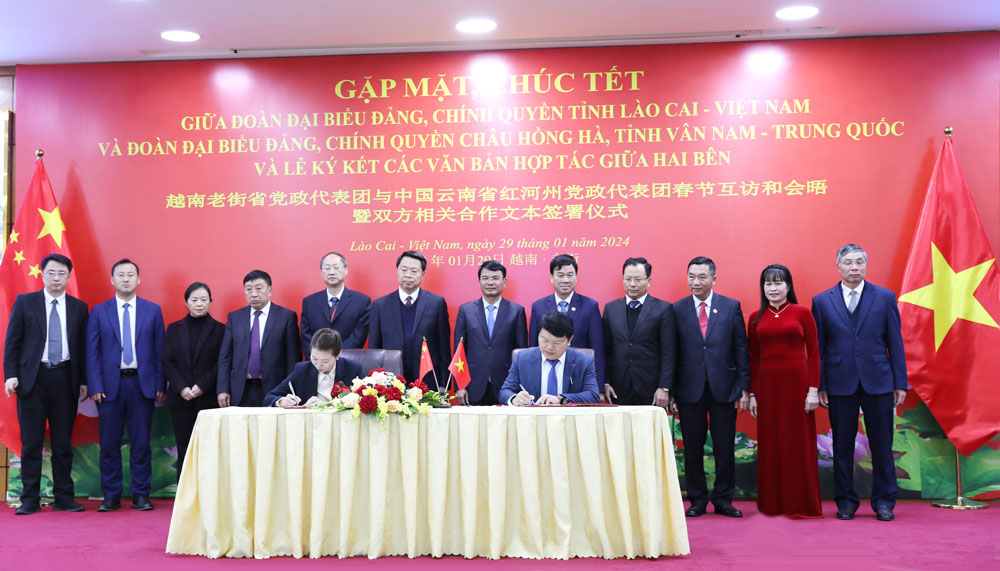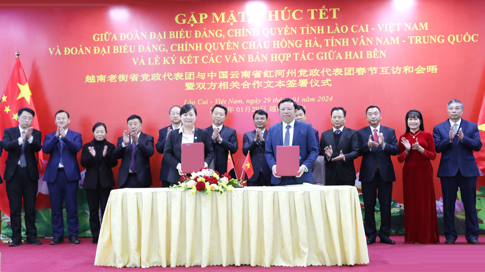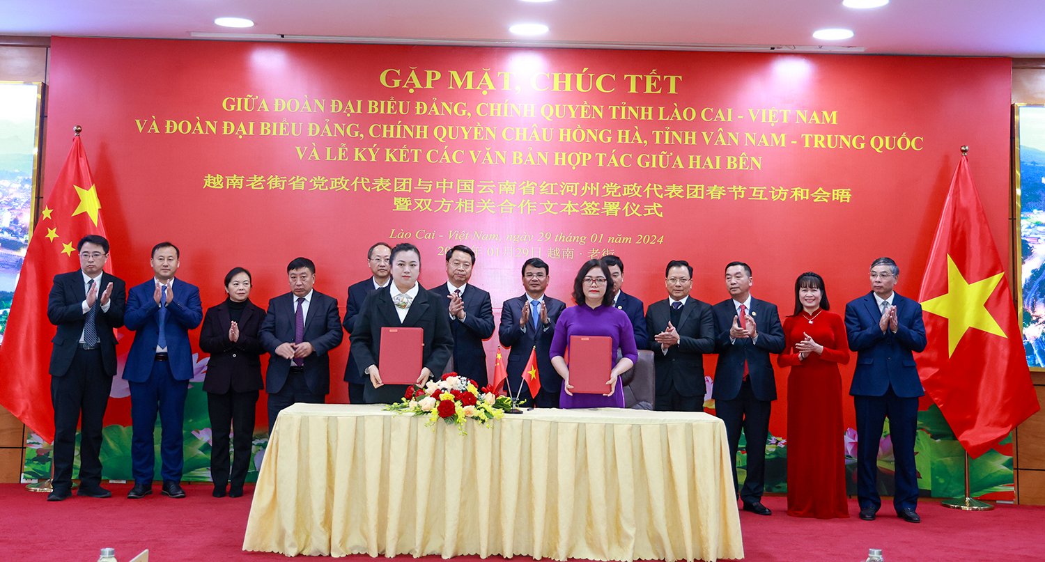 Chiều 29/01, trong khuôn khổ Chương trình Giao lưu văn nghệ chào Xuân qua biên giới và Liên hoan Nhân dân biên giới Việt Nam - Trung Quốc năm 2024, tại Trung tâm Hội nghị tỉnh Lào Cai diễn ra buổi gặp mặt, chúc Tết giữa Đoàn đại biểu Đảng, Chính quyền tỉnh Lào Cai (Việt Nam) và châu Hồng Hà (Trung Quốc) và Lễ ký kết các văn bản hợp tác giữa hai bên.
