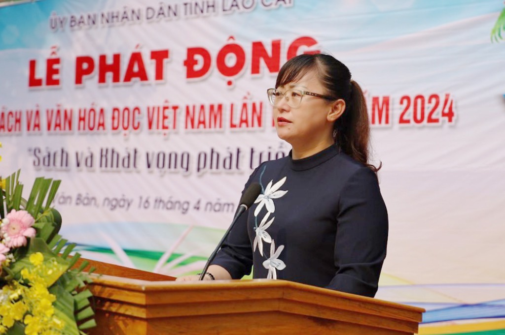 Phát biểu khai mạc và phát động Ngày sách và Văn hóa đọc lần thứ III năm 2024, đồng chí Giàng Thị Dung khẳng định: Sự kiện Ngày Sách và Văn hóa đọc Việt Nam đã trở thành sự kiện văn hóa, lan tỏa trong mọi tầng lớp nhân dân, mang lại nhiều giá trị thiết thực, khẳng định vị thế quan trọng của sách trong xã hội. Đối với tỉnh Lào Cai, qua 7 năm tổ chức Ngày sách Việt Nam và 3 năm tổ chức Ngày sách và Văn hóa đọc Việt Nam, tỉnh Lào Cai đã có nhiều chương trình, hoạt động ý nghĩa để duy trì, tiếp nối truyền thống hiếu học, trọng tri thức, góp phần xây dựng nền văn hóa Việt Nam tiên tiến, đậm đà bản sắc dân tộc. Đồng chí đề nghị mỗi tổ chức, cá nhân, các cấp, các ngành hãy chung tay góp sức xây dựng một phong trào đọc sách, chung tay kết nối hành trình “Gieo sách – Gieo yêu thương”, góp phần đưa ánh sáng văn học đến với học sinh vùng cao, hướng tới xây dựng xã hội học tập, hướng tới một phong trào học tập và học tập suốt đời.