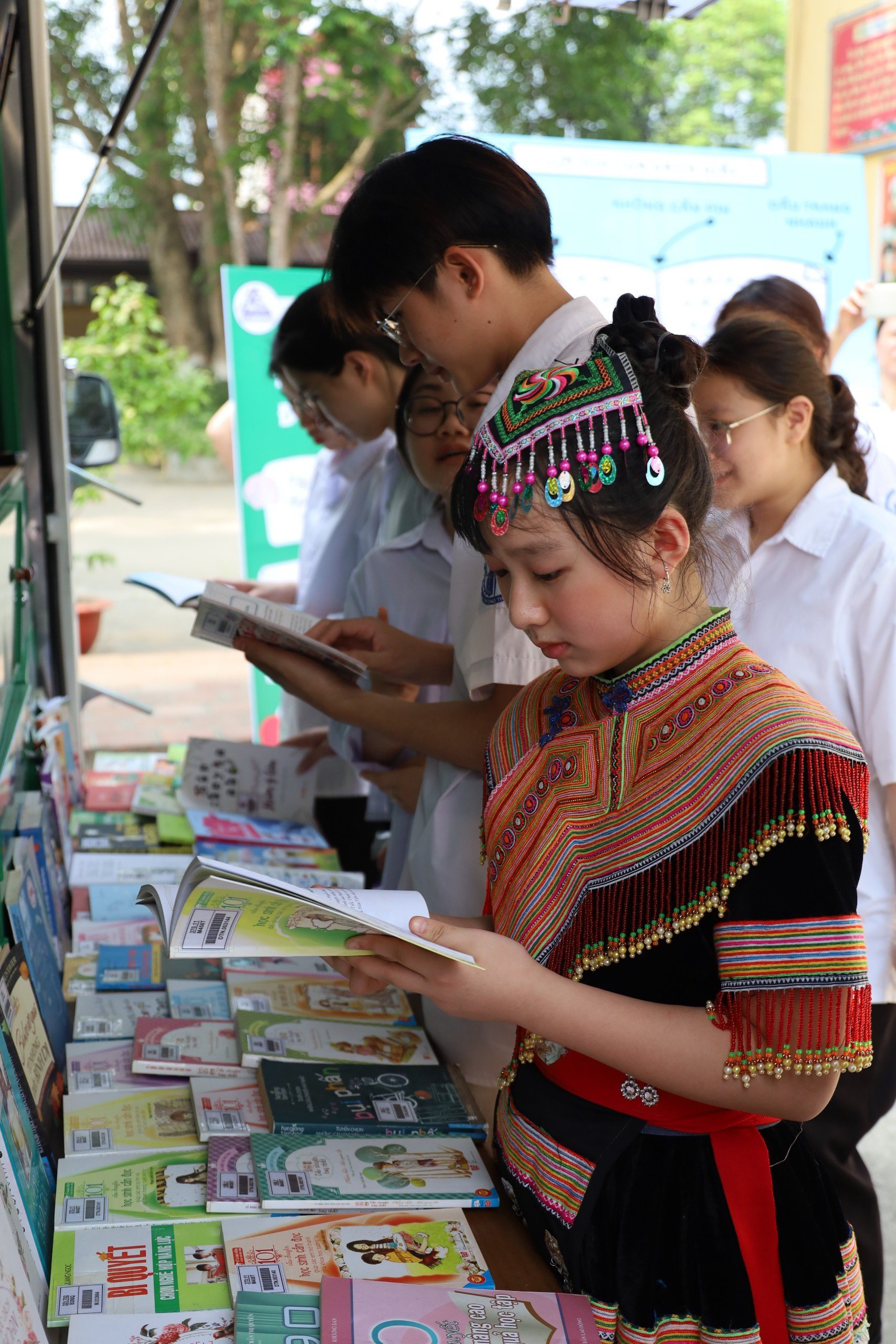 Học sinh các trường học ở Văn Bàn đọc sách tại Xe thư viện lưu động và quầy sách của Thư viện tỉnh.