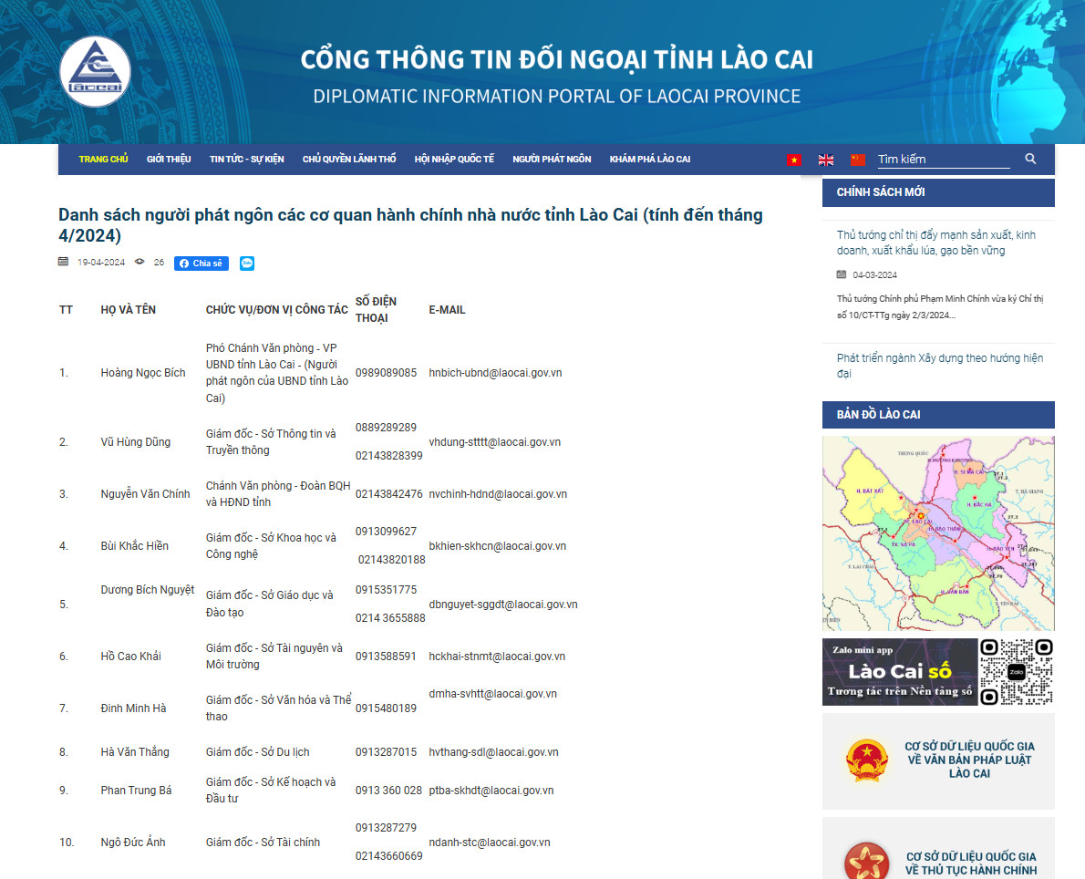 Tỉnh Lào Cai thường xuyên cập nhật, công bố thông tin người phát ngôn và cung cấp thông tin cho báo chí của các cơ quan, đơn vị, địa phương trên Cổng thông tin đối ngoại tỉnh Lào Cai.