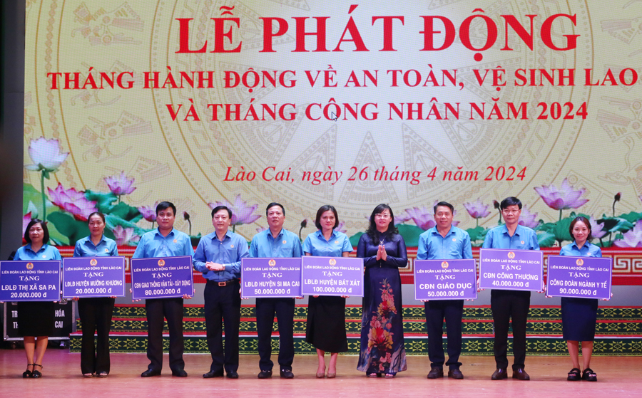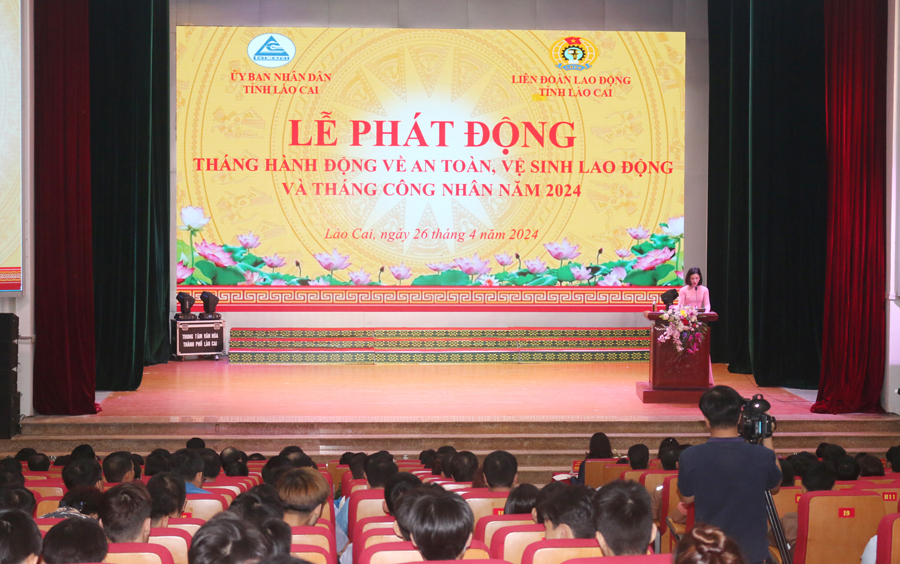 Sáng 26/4, Ủy ban nhân dân tỉnh phối hợp với Liên đoàn Lao động tỉnh Lào Cai tổ chức Lễ phát động Tháng hành động về an toàn vệ sinh lao động và Tháng Công nhân năm 2024.Tham dự Lễ phát động có đồng chí Giàng Thị Dung - Phó Chủ tịch UBND tỉnh; lãnh đạo các sở, ban, ngành; lãnh đạo UBND các huyện, thị xã, thành phố; lãnh đạo các doanh nghiệp trên địa bàn tỉnh và trên 300 công nhân lao động, đoàn viên công đoàn đại diện cho giai cấp công nhân, nhân dân lao động của tỉnh Lào Cai.