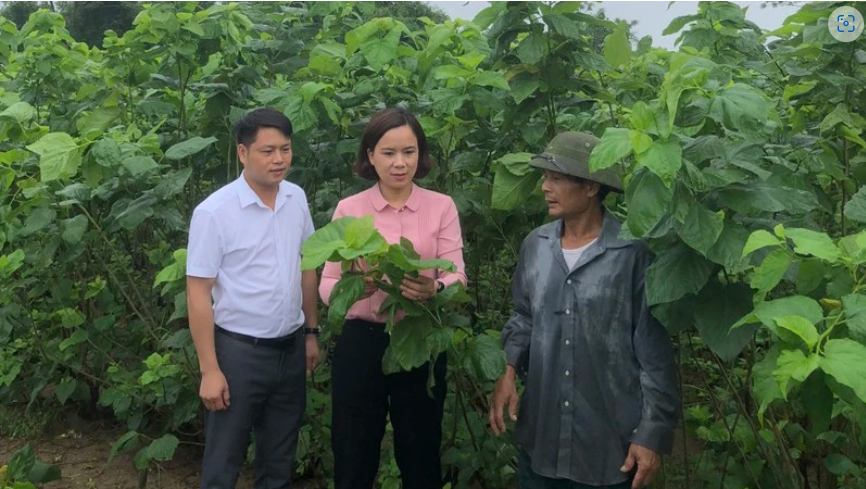 Chủ tịch UBND xã Việt Thành, huyện Trấn Yên (Yên Bái) Nguyễn Thị Tuyết Nga cùng nhân dân giám sát, kiểm tra quy trình trồng cây dâu tằm nhằm thực hiện quy hoạch mở rộng sản xuất nông nghiệp theo hướng hàng hóa. (Ảnh: Thanh Sơn)