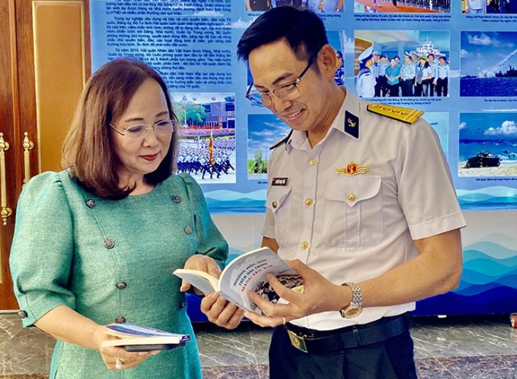 Chị Nguyễn Việt Triều trao đổi với cán bộ Quân chủng Hải quân về công tác tuyên truyền biển, đảo Việt Nam.