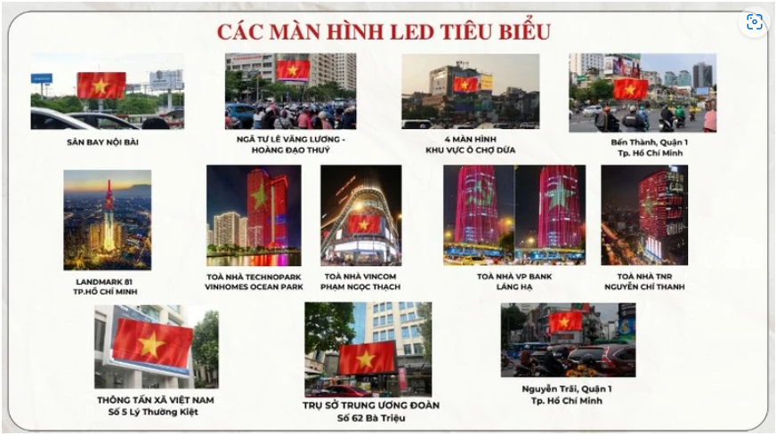 Theo đó, vào sáng 2/9, Schannel sẽ kết hợp với các đơn vị quản lý các màn hình LED khổng lồ tại các tỉnh, thành phố lớn trên cả nước như: Hà Nội, Thành phố Hồ Chí Minh, Đà Nẵng, Nghệ An, Hải Phòng, Hải Dương, Thanh Hoá, Cần Thơ… triển khai hoạt động trình chiếu hình ảnh cờ Tổ quốc vào khoảng thời gian từ 5 giờ đến 6 giờ sáng và lặp lại trong ngày.