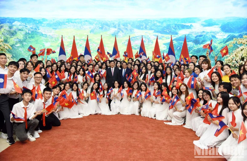 Thủ tướng Phạm Minh Chính và Tổng Bí thư, Chủ tịch nước Lào Thongloun Sisoulith với các thanh niên Việt Nam. (Ảnh:TRẦN HẢI)