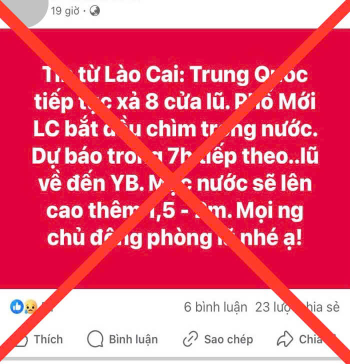 Liên quan đến công tác rà soát, xử lý thông tin vi phạm trên không gian mạng, sáng 12/9, Công an tỉnh, Sở Thông tin và Truyền thông tỉnh Lào Cai đã triệu tập 01 đối tượng liên quan đến việc tung tin sai sự thật về bão lũ trên không gian mạng.Cụ thể, Công an tỉnh, Sở Thông tin và Truyền thông đã triệu tập đối tượng Đ.T.A (sinh năm 1986), trú tại phường Nam Cường, thành phố Lào Cai có hành vi đăng tải thông tin “Trung Quốc tiếp tục xả 8 cửa lũ. Phố Mới Lào Cai bắt đầu chìm trong nước” trên mạng xã hội. Đây là thông tin sai sự thật, gây hoang mang cho Nhân dân, ảnh hưởng đến công tác phòng chống lụt bão của địa phương.