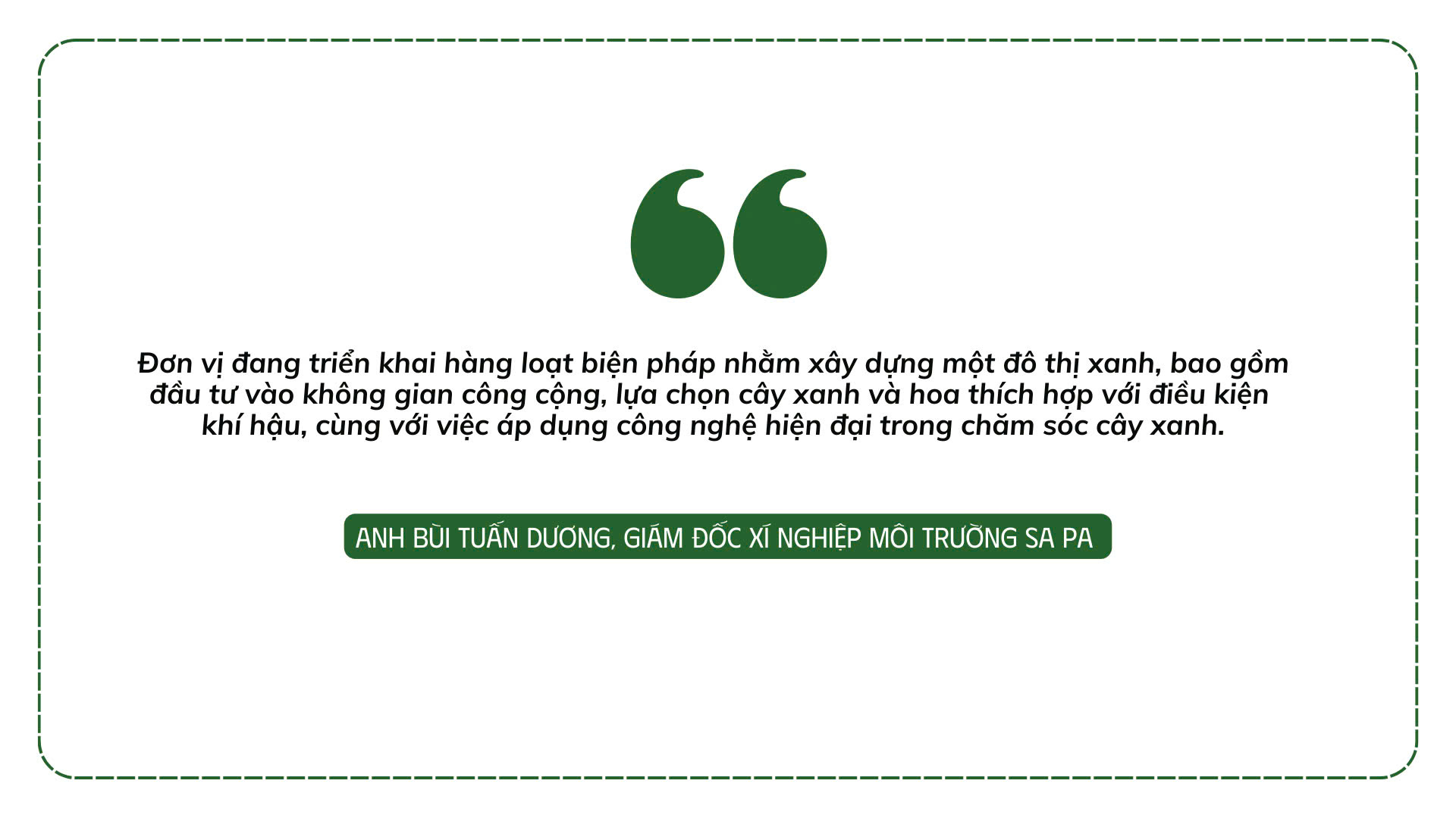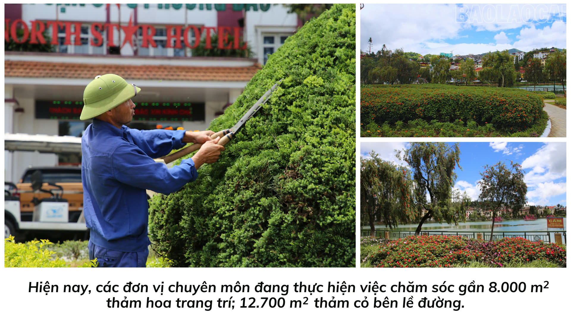 Hiện nay, các đơn vị chuyên môn đang thực hiện việc chăm sóc gần 8.000 m2 thảm hoa trang trí; 12.700 m2 thảm cỏ bên lề đường. Diện tích duy trì bồn hoa của Sa Pa là 4.630 m2, trong đó hoa dài ngày 2,383 m2; hoa thời vụ 2.2512... Ngoài diện tích hoa, cỏ trang trí, Sa Pa có hơn 800 cây xanh đô thị, chủ yếu là cây sa mộc, cây tùng... có tán nhỏ để phù hợp với đặc thù đô thị Sa Pa.