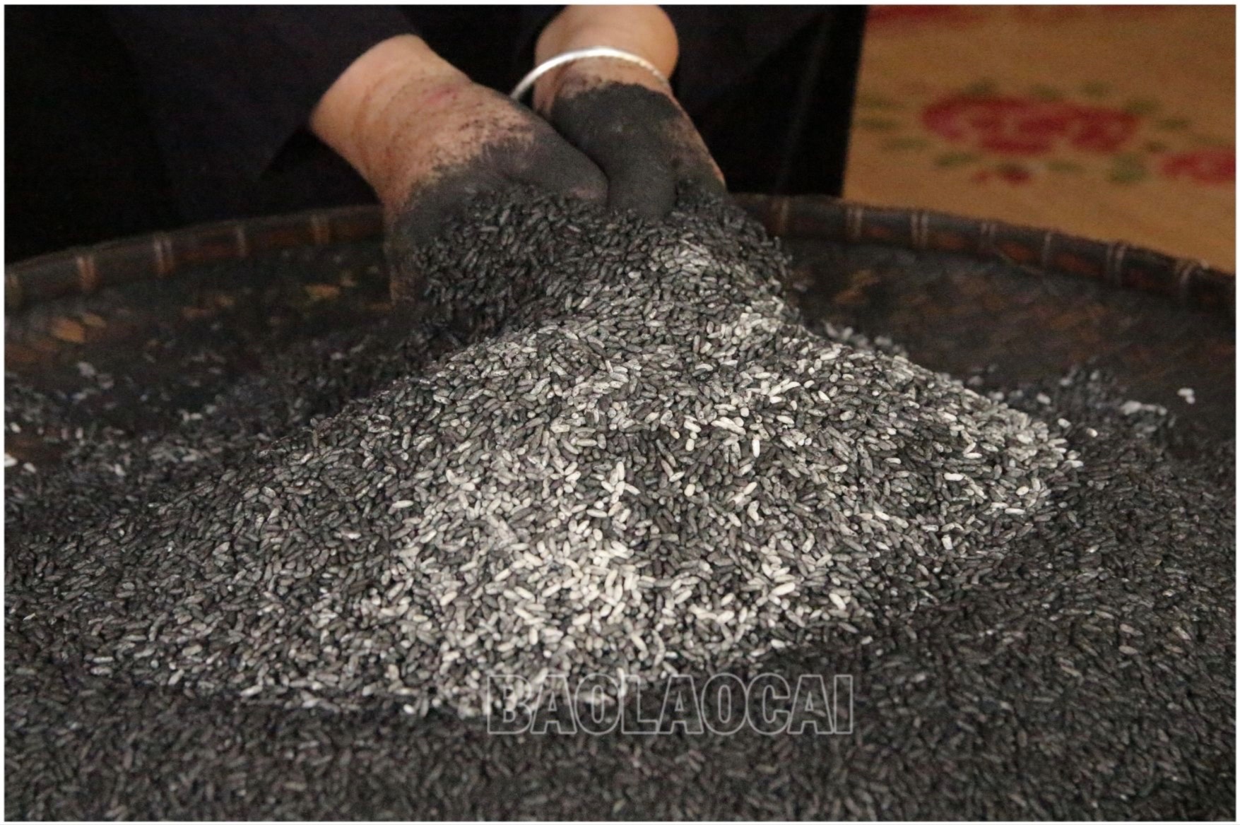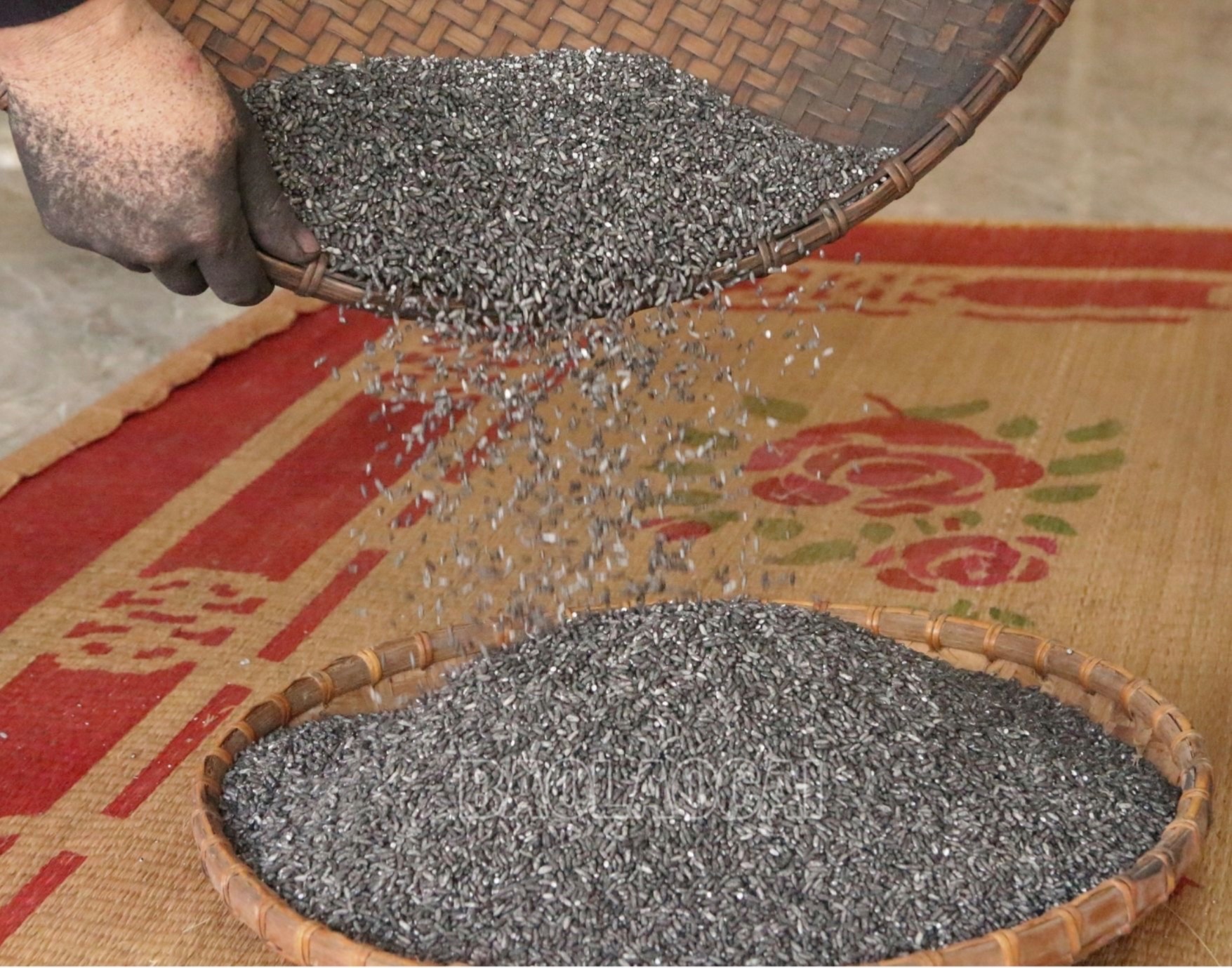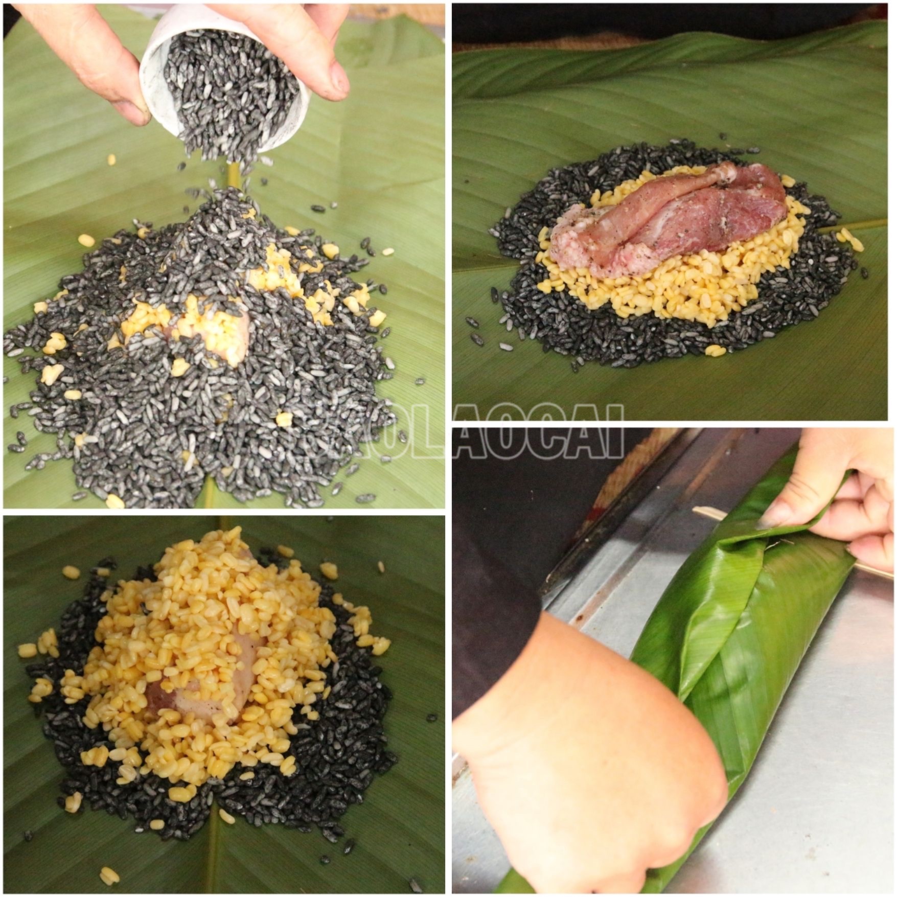 Thêm một điều đặc biệt nữa, những hạt gạo trắng sẽ không được gói ngay mà được trộn với một loại bột than đen. Bà con gọi đó là bột thân núc nác. Đây là cây dược liệu, có nhiều công dụng đối với sức khỏe con người và đặc biệt, loại bột này được coi như một chất bảo quản an toàn từ thiên nhiên. Chúng sẽ giữ chúng tôi ở nhiệt độ ngoài trời khoảng 4, 5 ngày mà không bị hỏng. Thân núc nác được chặt, phơi khô, đem đốt thành than. Sau đó than núc nác được xay nhuyễn, trộn với Khảu Tan Đón. Khi lớp bột than mịn áo đều trên hạt gạo, bà con sẽ đem gạo đi sảy, tạp chất sẽ bay đi giữ lại những hạt gạo bóng, đen đều để gói bánh.