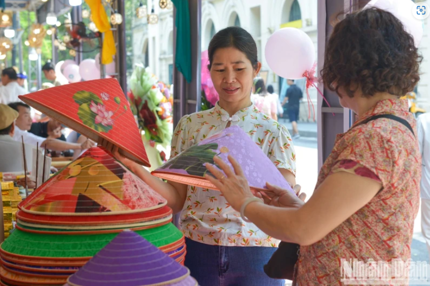 Người dân tham quan không gian của làng nghề nón làng Chuông (huyện Thanh Oai, Hà Nội) tại Festival Thu Hà Nội năm 2024. Ảnh: Thế Đại