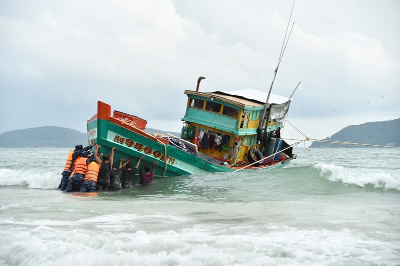 Cán bộ, chiến sĩ Lữ đoàn 127, Bộ Tư lệnh Vùng 5 Hải quân cứu kéo tàu cá Kiên Giang ra khỏi nơi mắc cạn.