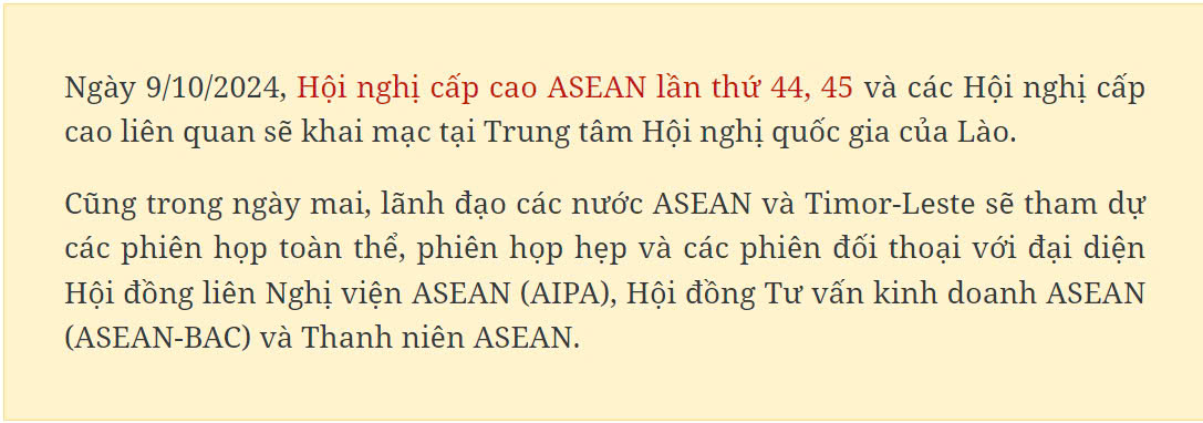 Ngày 8/10, tại Vientiane, Lào, đã diễn ra các Hội nghị Bộ trưởng Ngoại giao ASEAN, Hội đồng Cộng đồng Chính trị-An ninh ASEAN và Hội đồng Điều phối ASEAN. Đoàn Việt Nam do Phó Thủ tướng Chính phủ, Bộ trưởng Ngoại giao Bùi Thanh Sơn dẫn đầu tham dự các hội nghị.