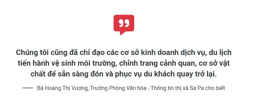 Ngay sau mưa lũ, thị xã Sa Pa đã nhanh chóng chỉ đạo các phòng, ban, đơn vị, các xã, phường phối hợp khắc phục hậu quả của thiên tai để ổn định cuộc sống, trong đó khôi phục hoạt động du lịch trên địa bàn. Một trong những nỗ lực chính là UBND thị xã đã chỉ đạo Phòng Quản lý đô thị, Ban Quản lý Dự án và UBND các xã, phường khẩn trương khôi phục hạ tầng, thông các tuyến giao thông; Phòng Văn hóa - Thông tin kiểm tra điều kiện an toàn của các khu, điểm du lịch để có định hướng khôi phục hoạt động. Đối với cơ sở vật chất phục vụ du lịch (các điểm du lịch, cơ sở lưu trú, dịch vụ ăn uống và các dịch vụ khách) Phòng Văn hóa và Thông tin chủ trì phối hợp với Hiệp hội du lịch tỉnh và UBND các xã phường tổ chức đánh giá mức độ an toàn và điều kiện cơ sở vật chất của các cơ sở lưu trú, homestay, dịch vụ ăn uống, quà tặng…