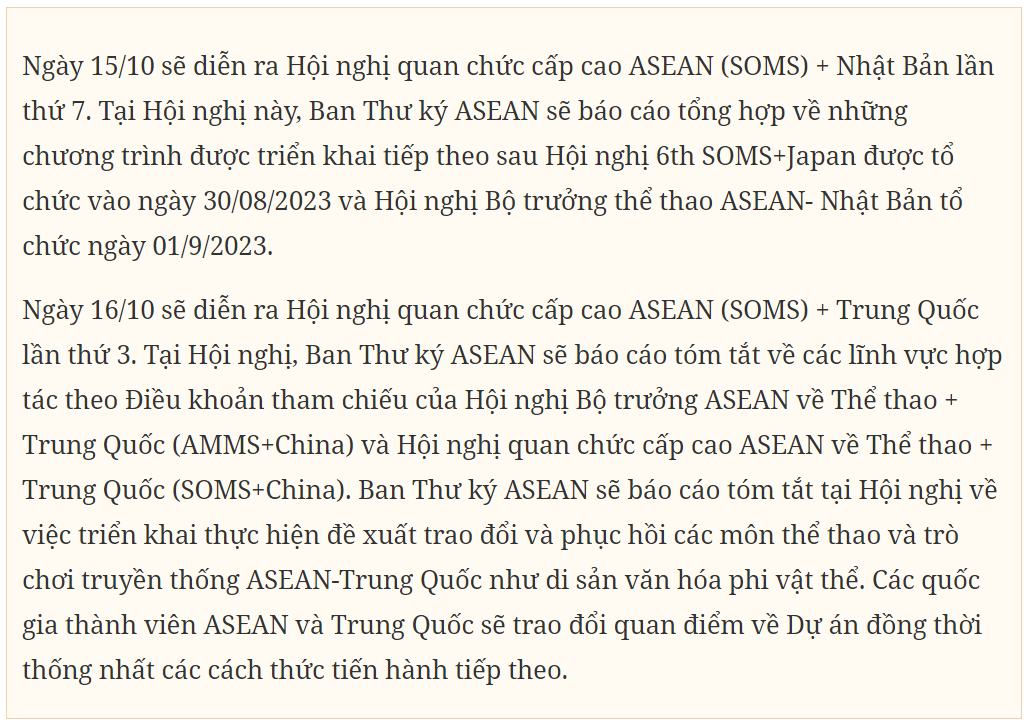 Hội nghị quan chức cấp cao ASEAN về thể thao lần thứ 15 (SOMS-15) nằm trong khuôn khổ chuỗi hội nghị quốc tế diễn ra tại Việt Nam từ 14-17/10 bao gồm: Hội nghị quan chức cấp cao ASEAN về thể thao lần thứ 15 (SOMS-15) và các Hội nghị liên quan; Hội nghị quan chức cấp cao ASEAN + Nhật Bản lần thứ 7 và Hội nghị quan chức cấp cao ASEAN + Trung Quốc lần thứ 3. Các Hội nghị do Bộ VHTTDL chỉ đạo, Cục TDTT chủ trì và triển khai công tác tổ chức.