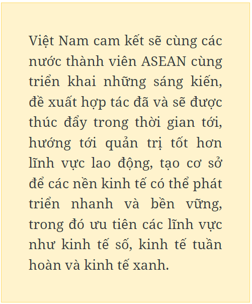 Theo đó, Việt Nam cam kết sẽ cùng các nước thành viên ASEAN cùng triển khai những sáng kiến, đề xuất hợp tác đã và sẽ được thúc đẩy trong thời gian tới, hướng tới quản trị tốt hơn lĩnh vực lao động, tạo cơ sở để các nền kinh tế có thể phát triển nhanh và bền vững, trong đó ưu tiên các lĩnh vực như kinh tế số, kinh tế tuần hoàn và kinh tế xanh.