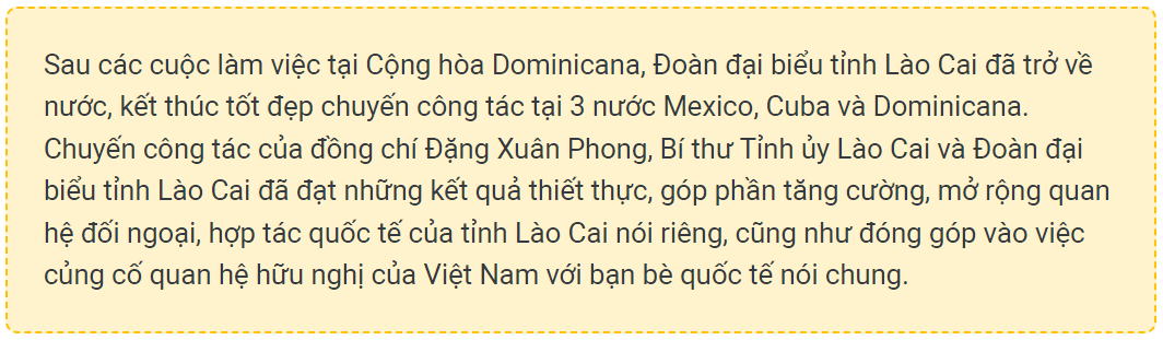 Trong 2 ngày (2 - 3/11), Đoàn đại biểu tỉnh Lào Cai do đồng chí Đặng Xuân Phong, Ủy viên Ban Chấp hành Trung ương Đảng, Bí thư Tỉnh ủy, Trưởng Đoàn đại biểu Quốc hội tỉnh làm Trưởng đoàn đã thăm và làm việc tại Cộng hòa Dominicana.