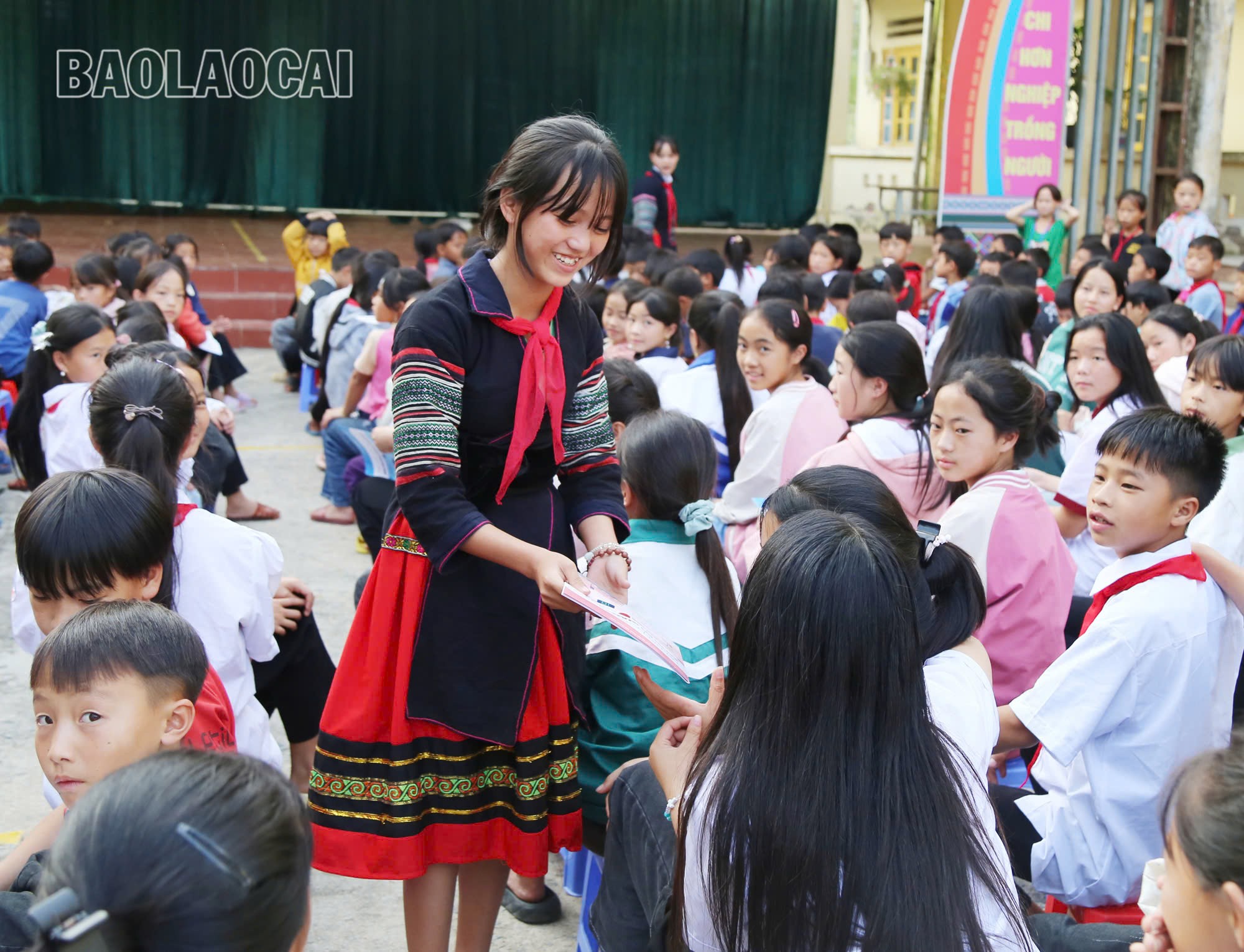 Các thành viên trong câu lạc bộ trợ giúp thầy cô phát tờ rơi tuyên truyền về tảo hôn, hôn nhân cận huyết thống, những hệ lụy của các vấn nạn trên đối với lứa tuổi học đường.