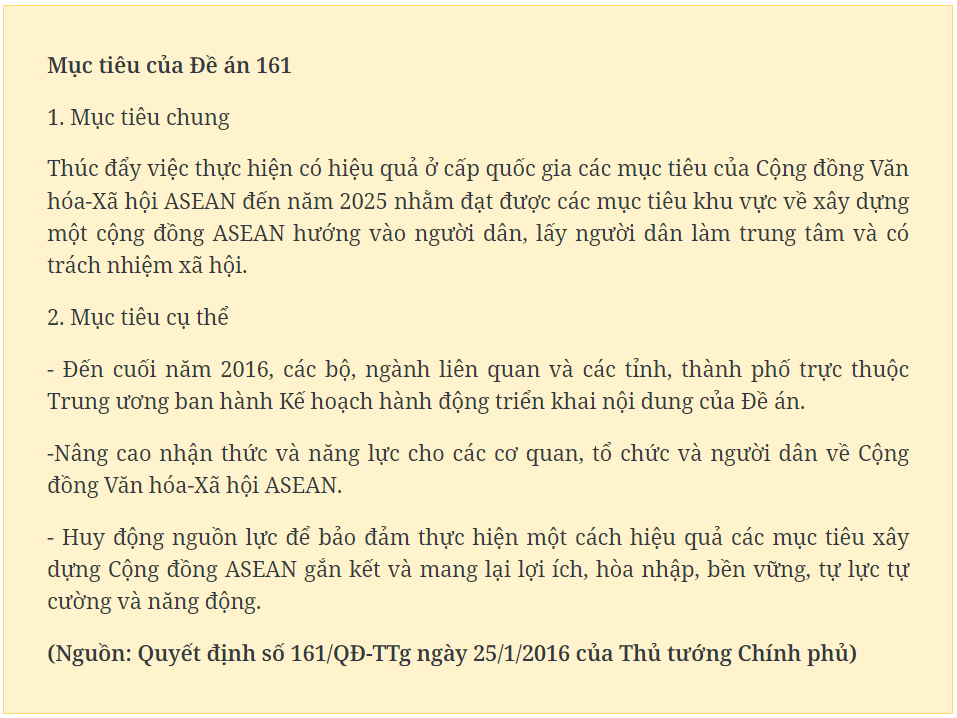 Đặc biệt, Bộ Thông tin và Truyền thông đã trình Thủ tướng Chính phủ ban hành Chương trình hành động về tuyên truyền, quảng bá ASEAN; Bộ Nội vụ trình Thủ tướng Chính phủ ban hành Đề án triển khai "Tuyên bố ASEAN về vai trò của nền công vụ làm chất xúc tác trong việc đạt được Tầm nhìn Cộng đồng ASEAN 2025”. Đây là các chương trình, đề án bổ trợ và đóng góp tích cực cho việc triển khai Đề án 161.