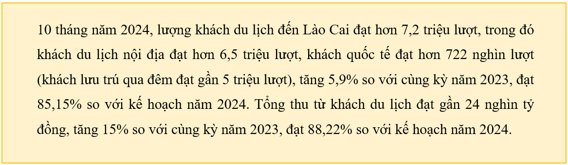 Mục tiêu là đưa Lào Cai trở thành tỉnh đứng đầu khu vực cả về lượng khách và doanh thu từ du lịch; đứng thứ 12/63 tỉnh, thành phố về lượng khách; đứng thứ 8/63 tỉnh, thành phố về doanh thu du lịch. Du lịch Lào Cai tiếp tục được du khách đánh giá là điểm du lịch hấp dẫn, Sa Pa lọt vào Top 5/7 điểm đến thịnh hành nhất thế giới năm 2024 do nền tảng du lịch trực tuyến hàng đầu thế giới Tripadvisor bình chọn.