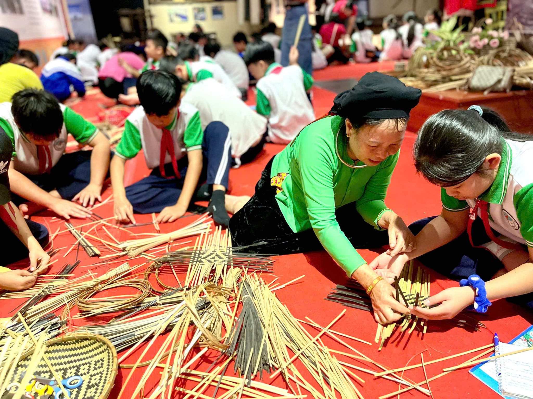 Các học sinh được nghệ nhân hướng dẫn thực hành một số nghề truyên thống của địa phương.
