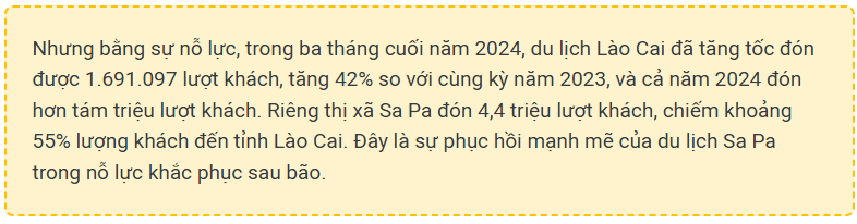 Phó Giám đốc Sở Du lịch Trần Sơn Bình nhận định: Năm 2024 đánh dấu một năm đầy thách thức đối với ngành du lịch Lào Cai, những biến động tình hình kinh tế-chính trị thế giới, ảnh hưởng của biến đổi khí hậu mà gần đây nhất là cơn bão số 3 (Yagi) đã khiến ngành chịu những dư chấn nặng nề. Sa Pa không phải là ngoại lệ.