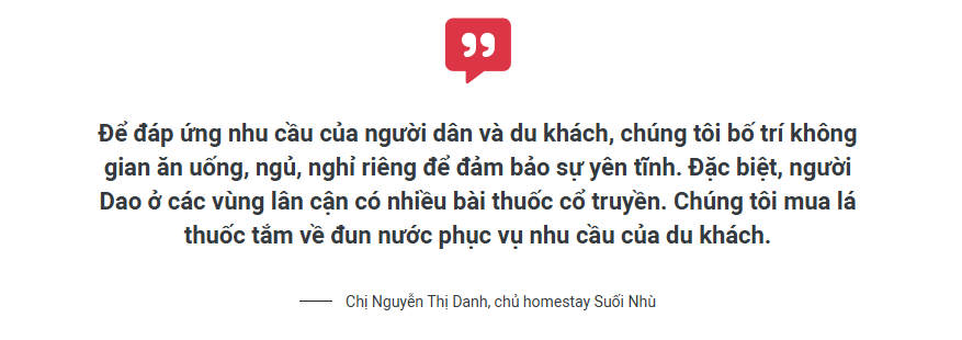 80 nghìn đồng/người/lượt ngâm tắm lá thuốc, những dịp cuối tuần, lễ, tết, hầu như khách đến nghỉ dưỡng tại đây đều đặt dịch vụ tắm lá thuốc. Đặc biệt, với xu hướng du lịch Tết, khoảng 2 năm trở lại đây, dịp nghỉ tết Nguyên đán, homestay Suối Nhù của nhà chị Danh lại đón các đoàn khách đến nghỉ dưỡng, ăn Tết cùng gia đình và trải nghiệm những ngày tết cổ truyền cùng người Tày trong thôn. Hiện đã có đoàn khách khoảng 40 người từ dưới xuôi đặt dịch vụ để thực hiện chuyến du lịch Tết tại đây.