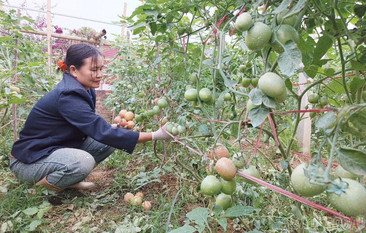 Gia đình chị Trịnh Thị Duyên Bích ở thôn Thái Bo, xã Thống Nhất, thành phố Lào Cai, vừa thu hoạch cây súp lơ, vừa chăm sóc cây mướp đắng trên cùng vườn rau màu.