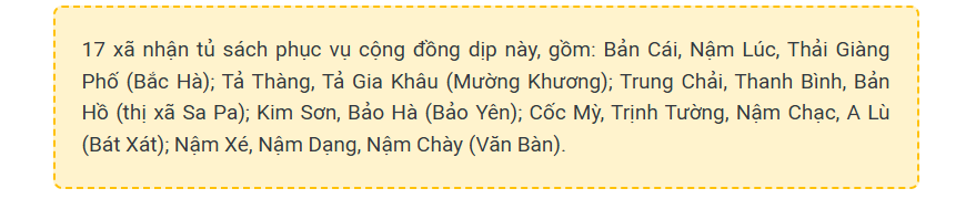 Dịp này, Thư viện tỉnh Lào Cai tổ chức bàn giao 17 tủ sách phục vụ cộng đồng tại 17 xã khu vực III thuộc các huyện, thị xã trên địa bàn tỉnh với tổng số hơn 5.400 cuốn sách.